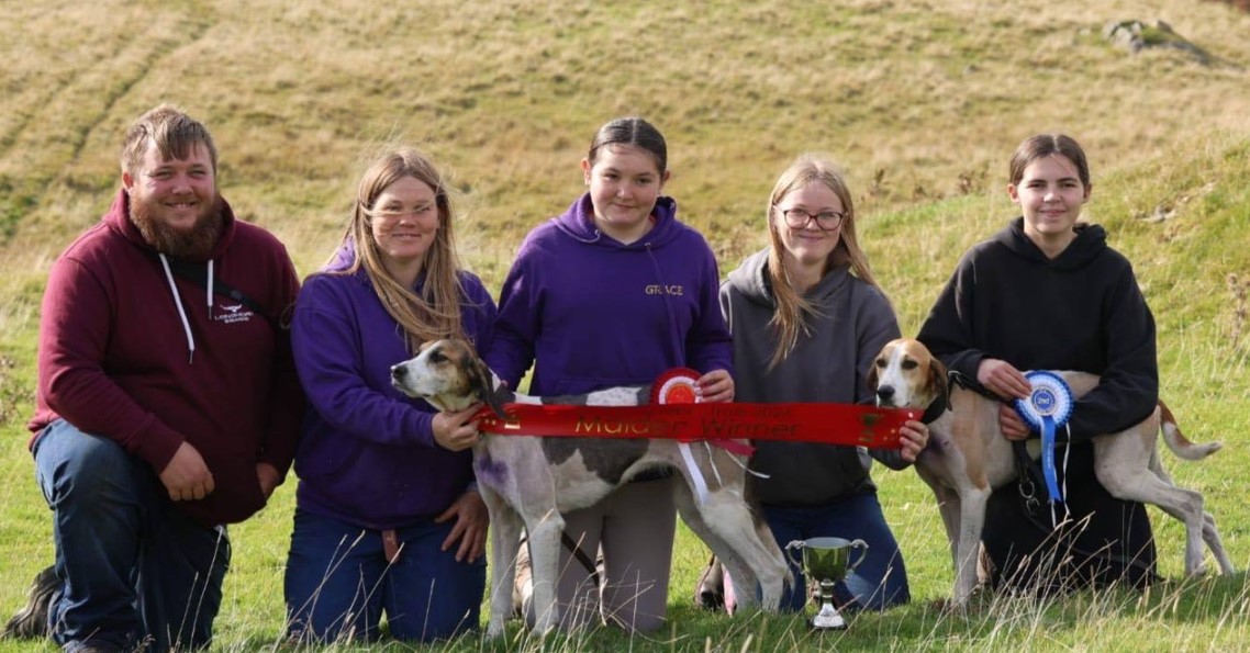 Neil Brady, Robyn, Grace, Ellie Napier and Erin Rowlandson with Foxparke Dealer and Foxparke Bugga Boo first and second in the Senior Maiden Trail